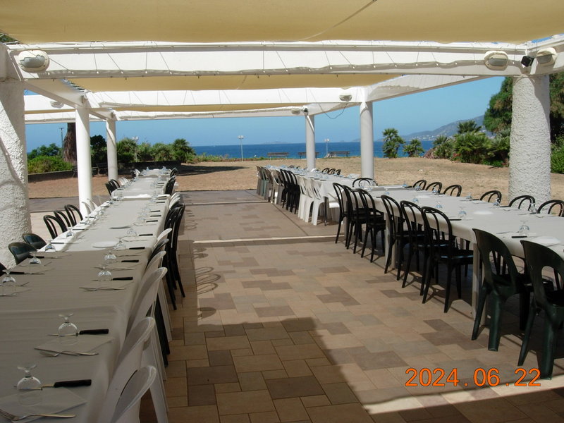 nous nous dirigeons vers les tables dressées sous des tonnelles à l ' extérieur en bord de mer