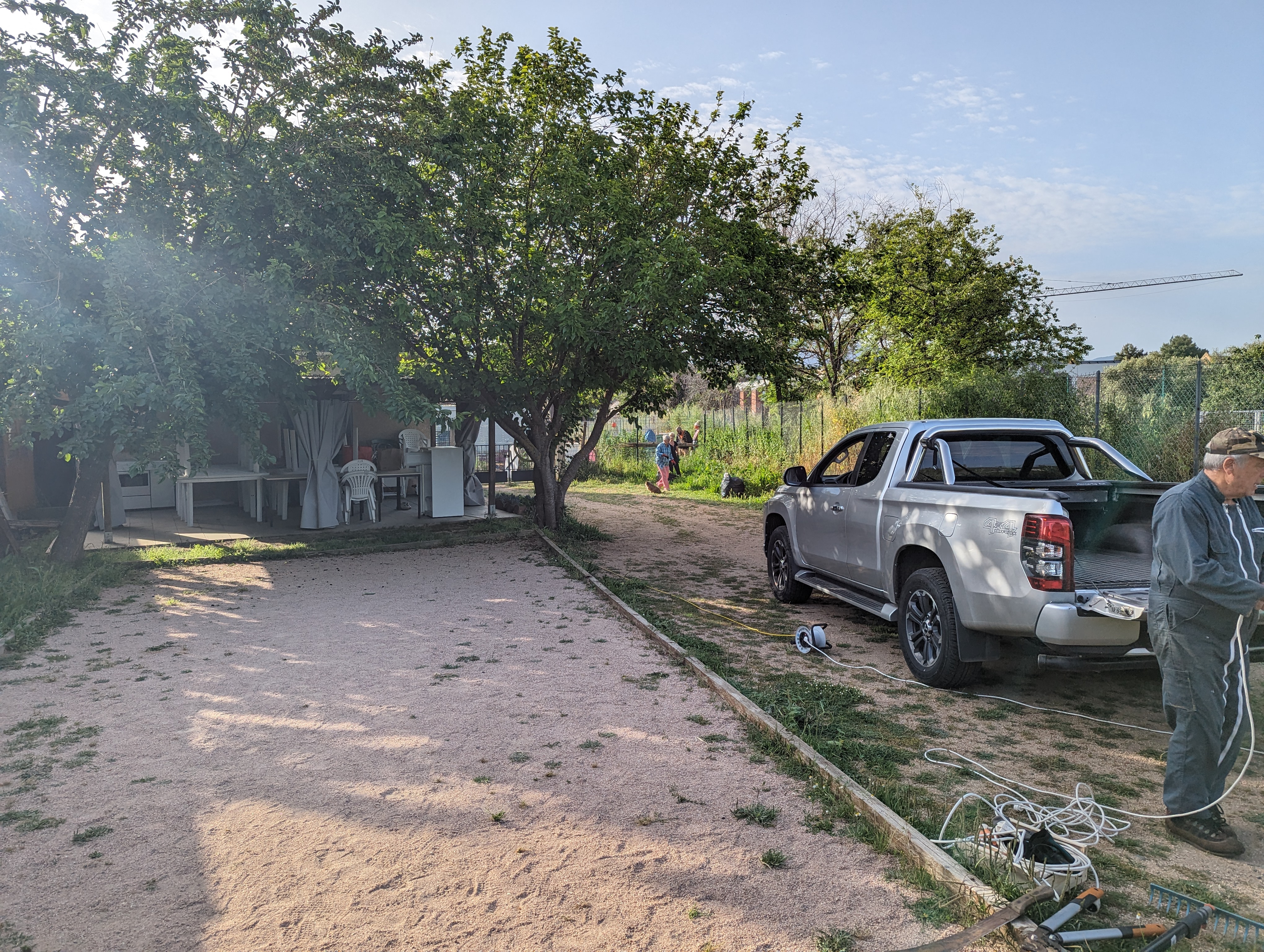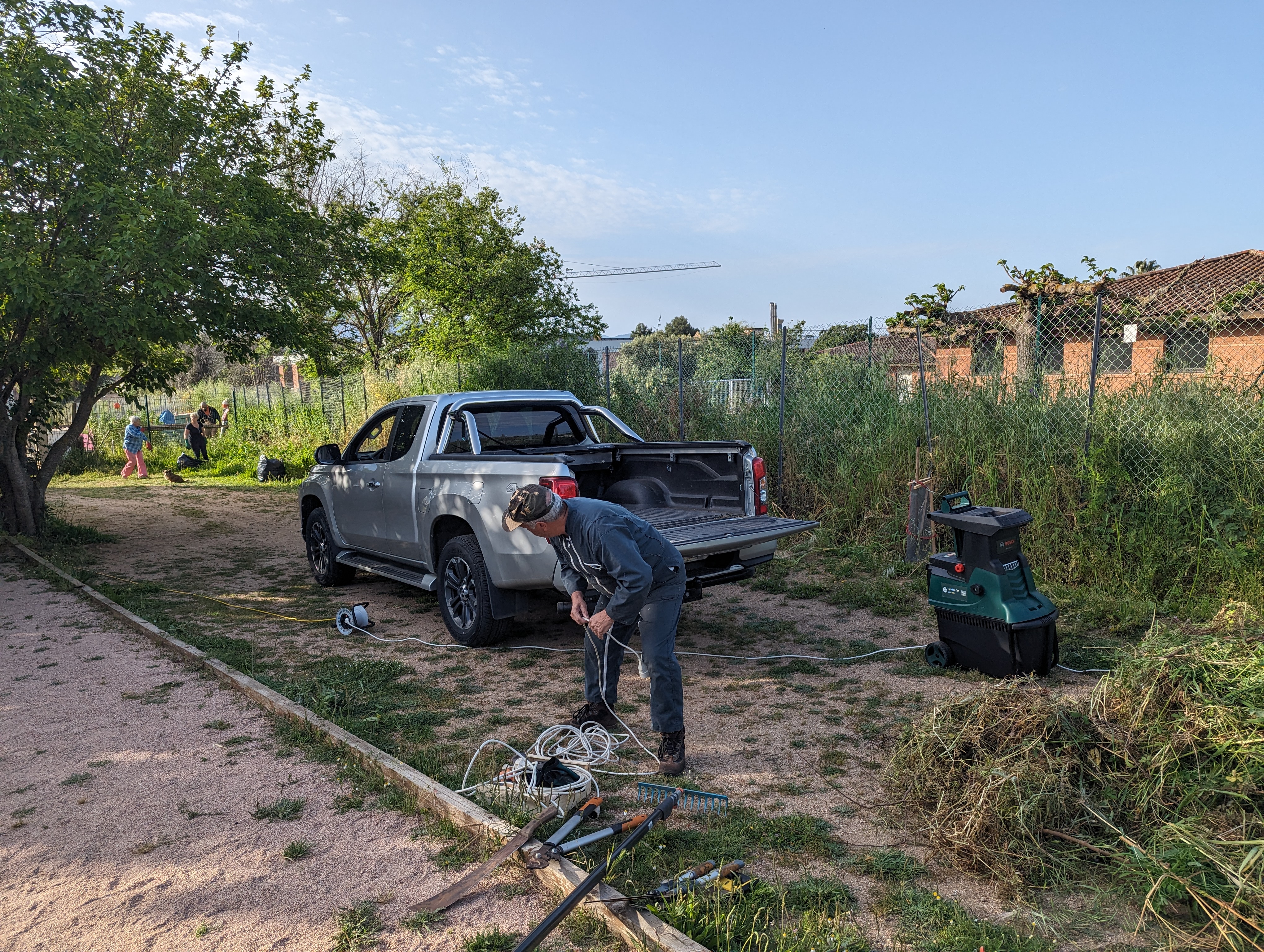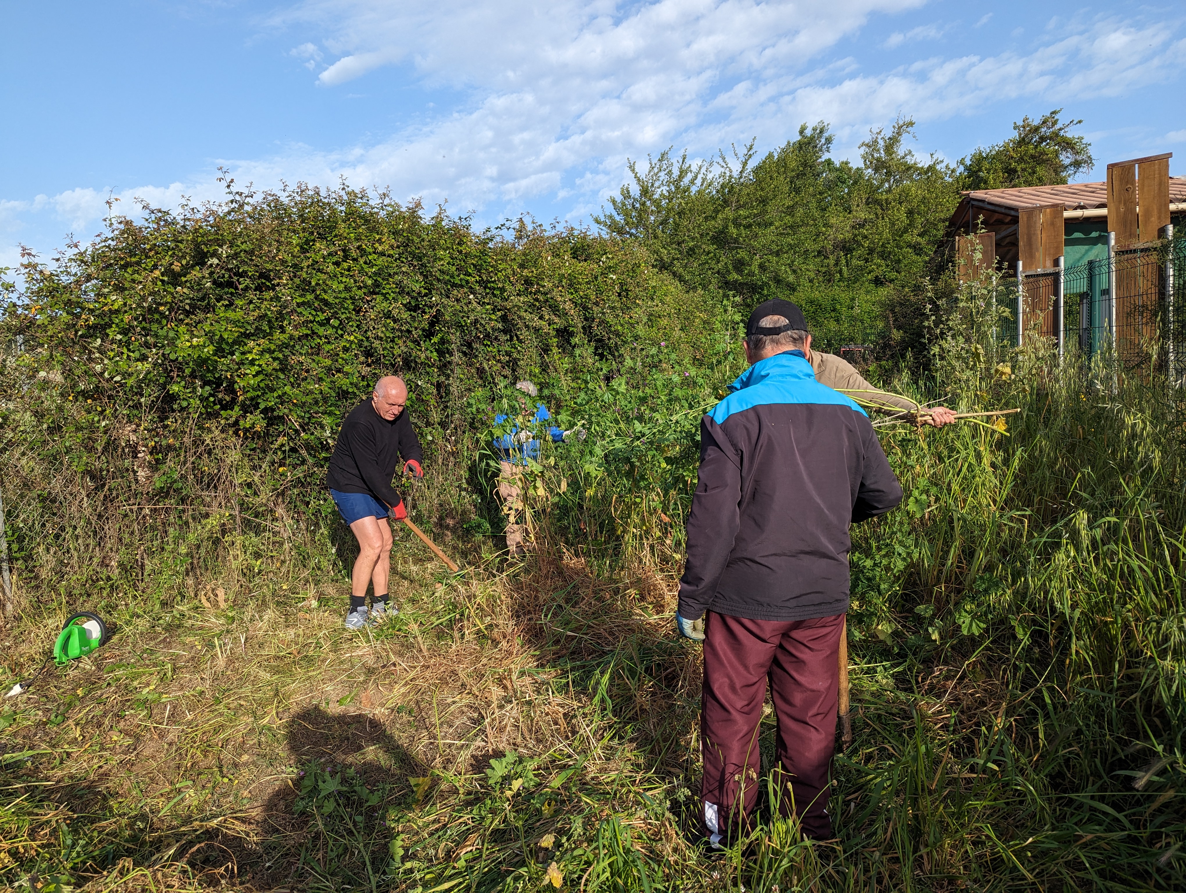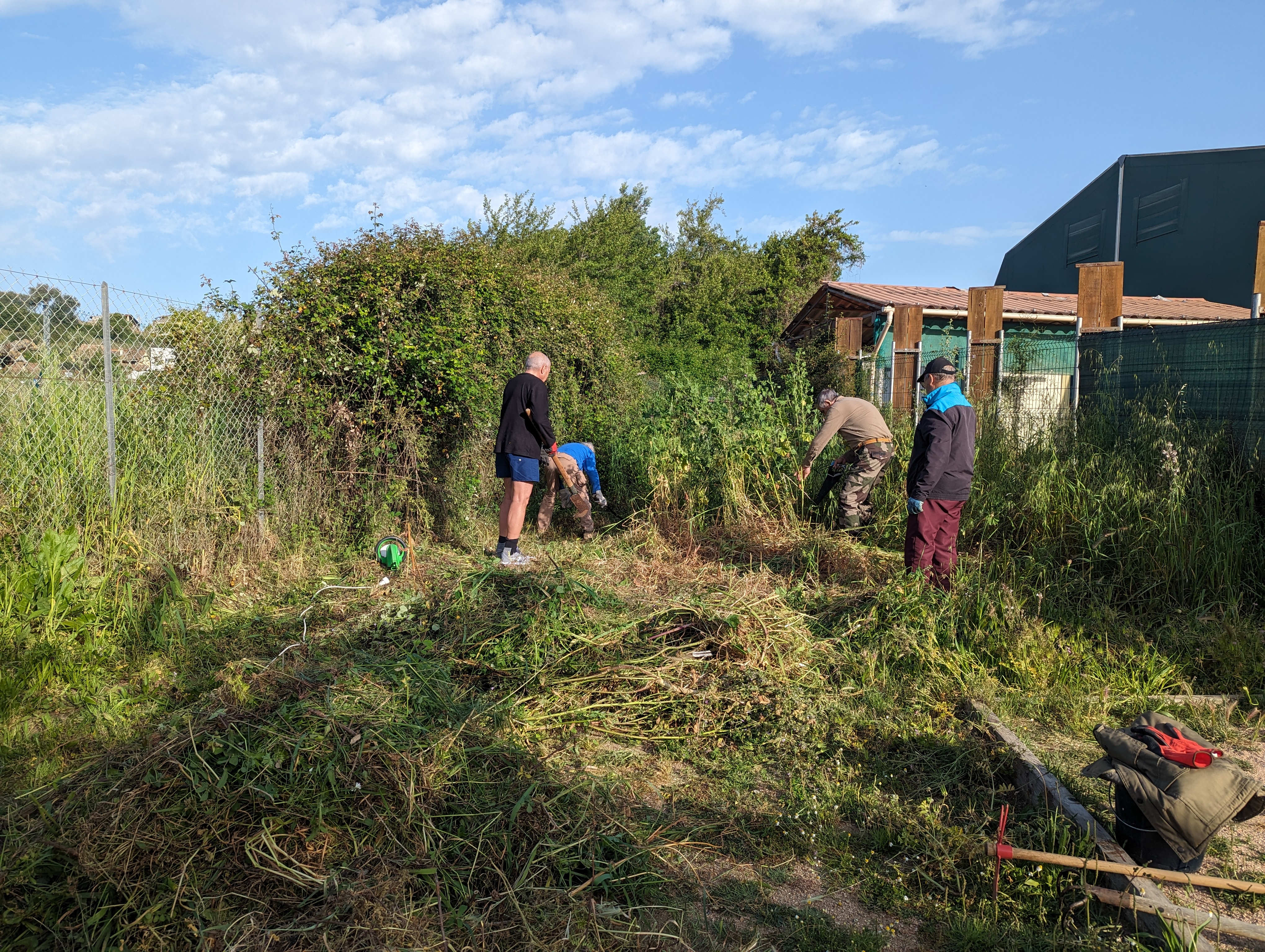 15 joyeux volontaires au rendez-vous ce matin. Le but est de débrousailler le terrain situé devant le local de l'association