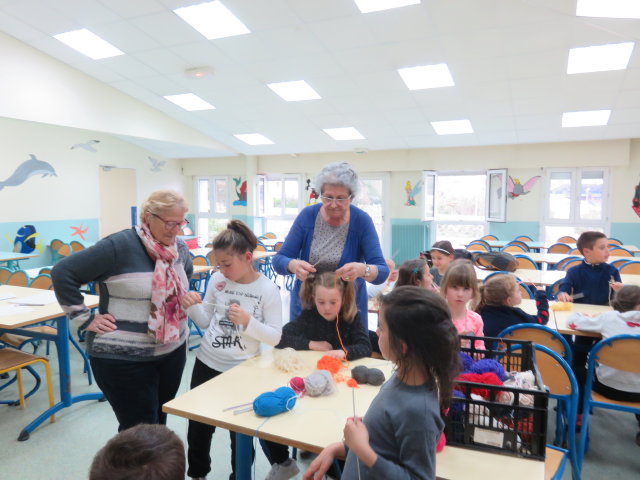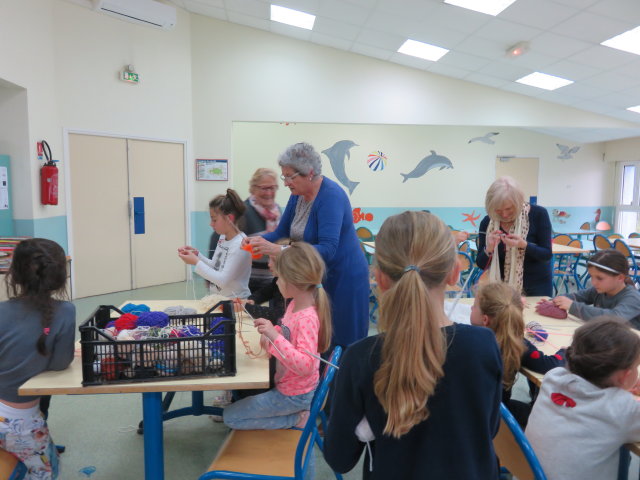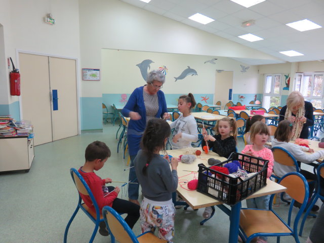 Les mailles montées, les enfants ont commencé à tricoter: "on pique l'aiguille dans la maille, on passe le fil entre les aiguilles, on fait